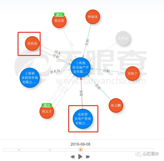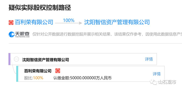 扬业地产的工商信息可以看到,2015年之前,扬业地产是自然人周宝才一人控股的企业,2016年,在城昱置业挂牌转让之后,扬业地产的股权和公司人员结构发生了巨大的变化,公司的唯一控股股东变为了沈阳智信资产管理有限公司,公司的法人和董事长变为了周莉莉。沈阳智信资产管理有限公司的唯一控股股东即之前提到的百利荣有限公司。也就是说扬业地产在2015年之后也通过股权变更,复制了城昱控股的人员结构和股权结构。