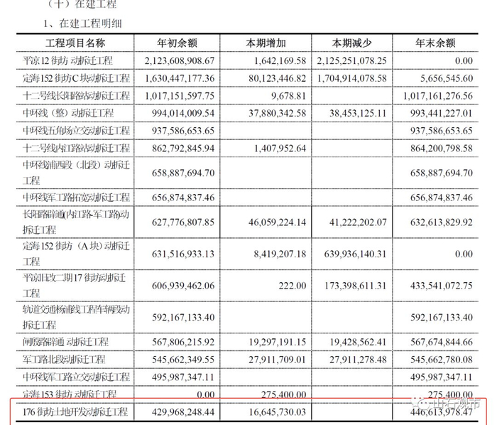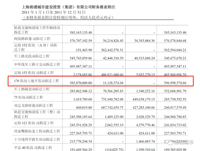 从年报中,我们可以清楚的看到从拍到地的第一天起,杨浦城投就把176这块地的成本以在建工程余额的形式体现在了在建工程一栏。这与其他的拆迁工程似乎是显而易见完全不同的概念。