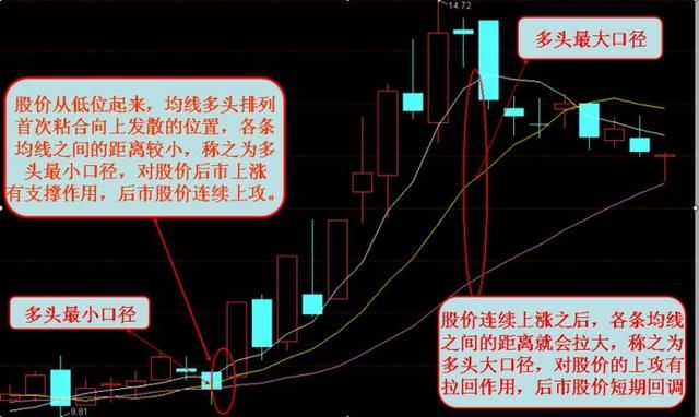 而证券市场均线技术分析中所说的均线口径,指的是各条移动平均线开口之间的距离,如各条移动平均线之间的距离较小,称之为均线小口径,对股价后市有支撑或压制作用。反之,如果各条均线之间的口径距离较大,反而对股价短期走势会有拉回作用,通过观察各条均线口径之间距离的大小,从而指导投资者预判目前的股价趋势是刚刚启动还是即将出现反转拐点。