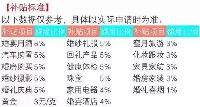 补贴标准为黄金3 元/克,汽车消费500元/辆,婚纱摄影等其他消费项目按平均消费额的5%予以补贴。