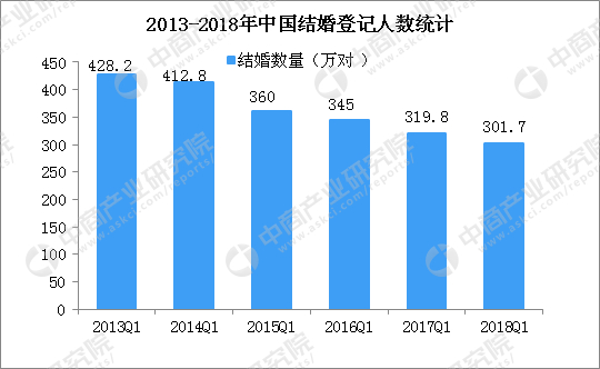 据民政部数据,2018年第一季度,全国结婚登记301.7万对,同比减少5.7%。其中,涉外及港澳台10162对。据悉,2018年第一季度结婚人数比五年前下降近三成。