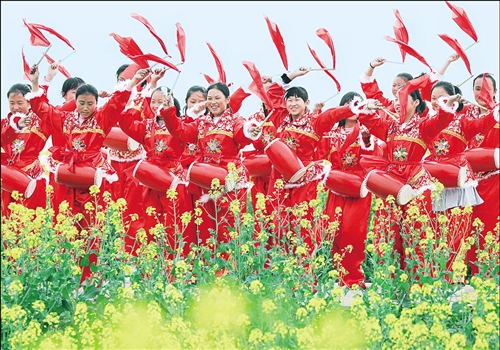 点评:火红的腰鼓在油菜花田间擂响,饱满的色彩与喜庆的动感交相辉映。