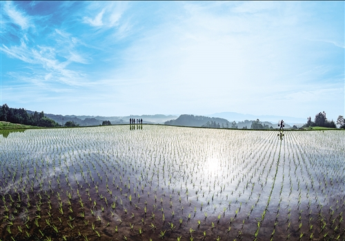 点评:稻田倒映着空中洁白的云朵,田间劳作的人们点缀其间,孕育着春天的希望。