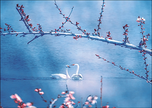 点评:天鹅亲密无间,含苞待放的花朵预示着春天的到来。