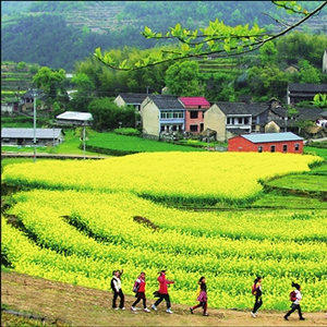 点评:树枝的新芽,上学路上的孩童,繁花似锦的田野组成了和谐的美丽乡村春季美景。
