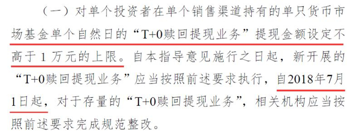 一个月前,央行和证监会联合发布《关于进一步规范货币市场基金互联网销售、赎回相关服务的指导意见》,对单个投资者在单个销售渠道持有的单只货币基金单个自然日的“T+0”赎回提现金额设置了上限1万元,7月1日起正式实施。