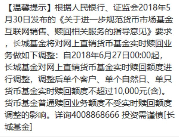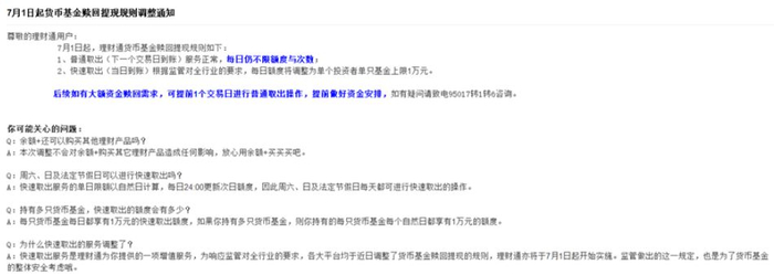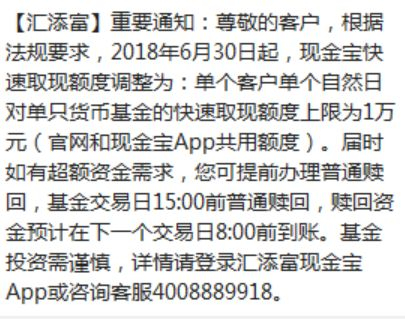 此外,微众银行、东方财富、汇添富、长城基金、理财通等多家机构都在6月底之前向投资者通知,货基T+0提现限额降至1万元。