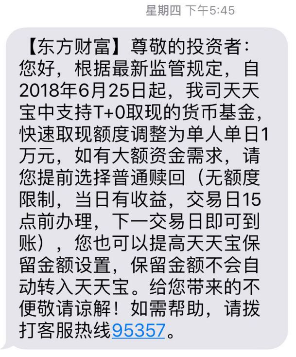 近日,按照新规要求已有多家机构提前整改完成,并在官网或短信通知投资者,包括微众银行、中信证券、东方财富、汇添富、长城基金、理财通等机构都在6月底之前通知投资者:实行T+0赎回限额1万元,大额资金普通赎回则实行T+1。