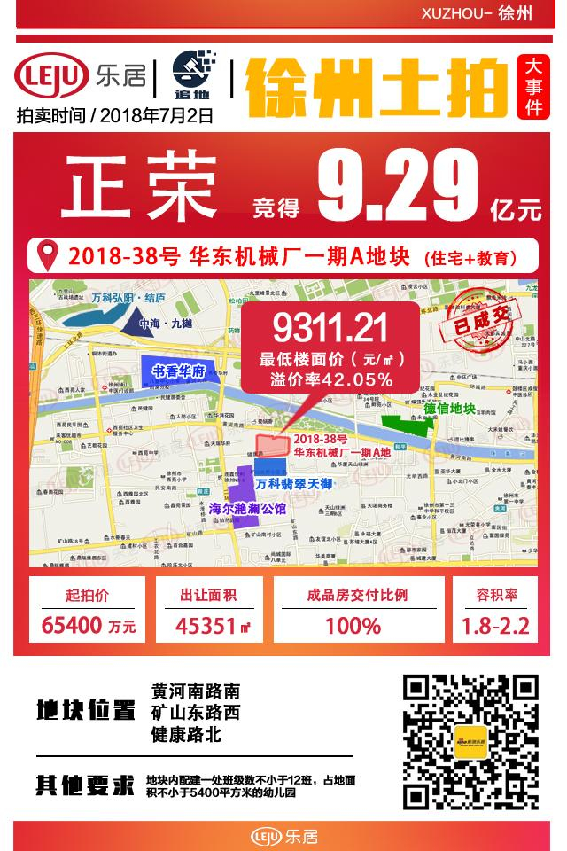 7月2日下午三点开始,历时3个多小时,148轮竞价,最终徐州正铭置业发展有限公司(正荣)以9.29亿元强势摘得2018-38号华东机械厂一期A地块,溢价率42.05%,最低楼面价9311.21元/㎡。