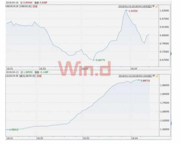 以1个月的HIBOR和LIBOR的利率走势之差来看,两者利差从2018年初的0.37%大幅上升至4月的1.04%。