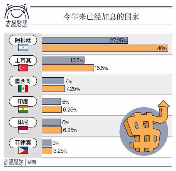 在美元升值另一面,是新兴经济体货币风险爆发,短时间内出现本币大幅贬值,相关国家央行不得不先后上调本国政策利率应对,以缓解大规模资金外流、外汇储备急剧缩水压力。
