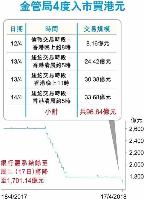 港币从去年1月开始,在人民币借美元超贬之机大幅升值一年多的背景下,港币却持续贬值,最近逼近并多次触碰7.85的上限(弱方兑换保证)。香港金管局从4月12日至4月19日,面对港元贬值,香港金管局在8个交易日内出手13次捍卫港元联席汇率制度,共计买入513亿港元“护盘”。金管局总裁陈德霖警告公众“谨慎管理风险,为利率和资产的潜在波动做好准备” 。