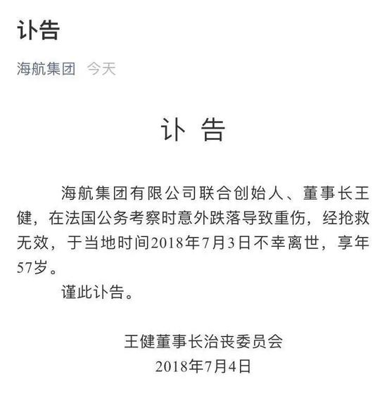 今日(7月4日)下午,海航集团有限公司(以下简称“海航集团”或“海航”)微信公众号发布讣告称,海航集团有限公司联合创始人、董事长王健,在法国公务考察时意外跌落导致重伤,经抢救无效,于当地时间2018年7月3日不幸离世,享年57岁。