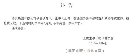 7月4日下午,海航集团发布讣告称,海航集团有限公司联合创始人、董事长王健在法国公务考察时意外跌落导致重伤,经抢救无效,于当地时间2018年7月3日不幸离世,享年57岁。