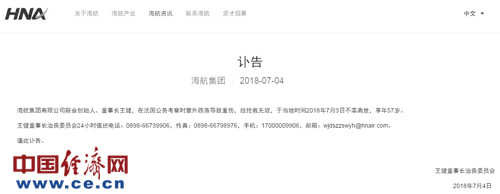 经济日报-中国经济网7月5日讯 7月4日,海航集团有限公司在官方网站发布讣告称,海航集团联合创始人、董事长王健在法国公务考察时意外跌落导致重伤,经抢救无效,于当地时间2018年7月3日去世,享年57岁。目前,海航集团已成立“王健董事长治丧委员会”处理善后相关事宜。