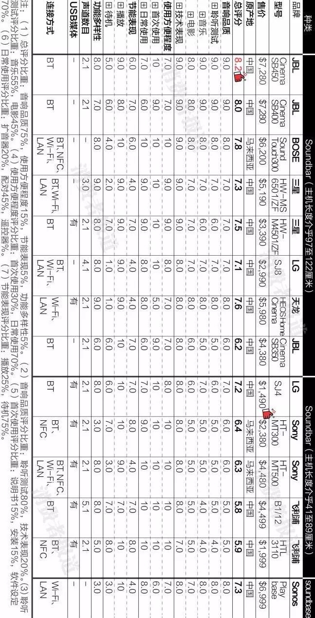 JBL Cinema SB450综合评分第一,但售价较高,适合追求高品质影音享受的消费者。特别之处是设有4K Pass-through功能并支持HDCP 2.2版权保护规格,通过 HDMI 就可实现将4K信号直接传输到合适的显示设备。