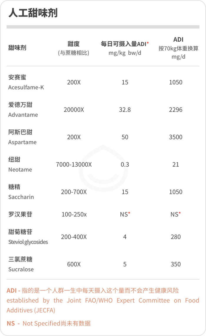 这类甜味剂的特点是:没有热量,或者甜度超高用量极少,热量可以忽略不计。(阿斯巴甜提供的热量跟蛋白质一样,4Kcal/g,但实在太甜了,用量非常小,所以热量可以忽略)