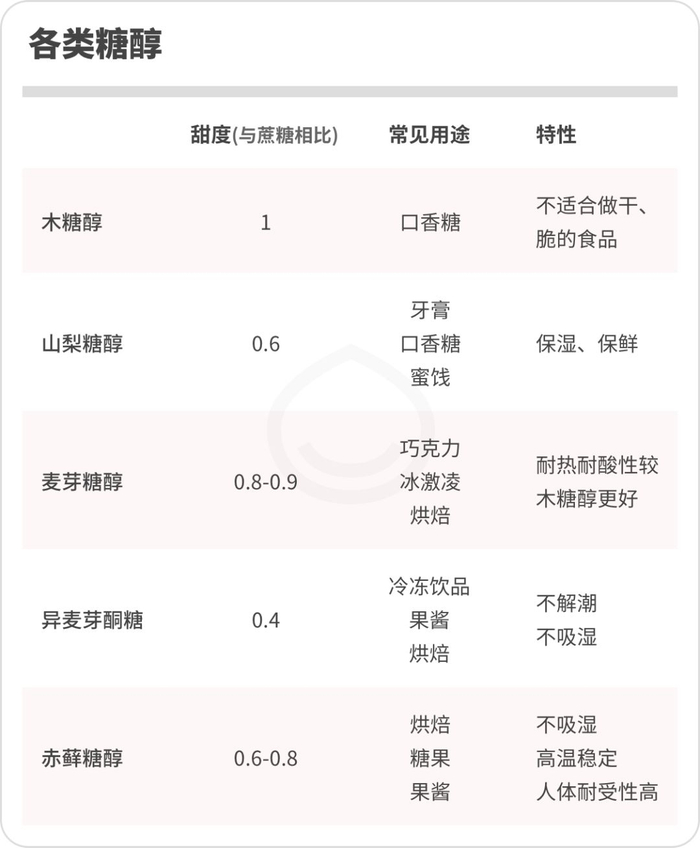 它们没有蔗糖甜,热量也比糖低。比如木糖醇的热量是1kcal/g,山梨糖醇是3kcal/g;赤藓糖醇因为不能被代谢,热量最低,几乎可以忽略不计。