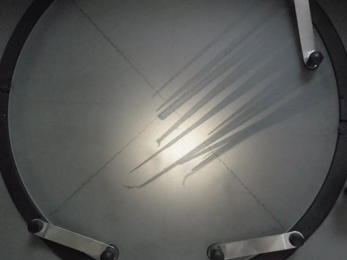 在高倍显微镜下,我们可以看到,7天酒店牙刷刷毛顶端大多都没有磨圆设计,存在锐角或毛刺。