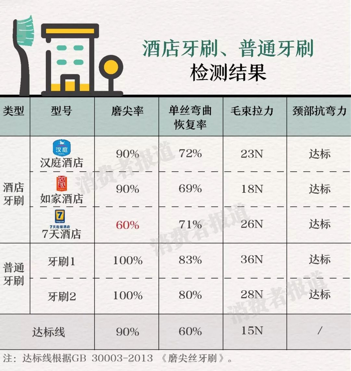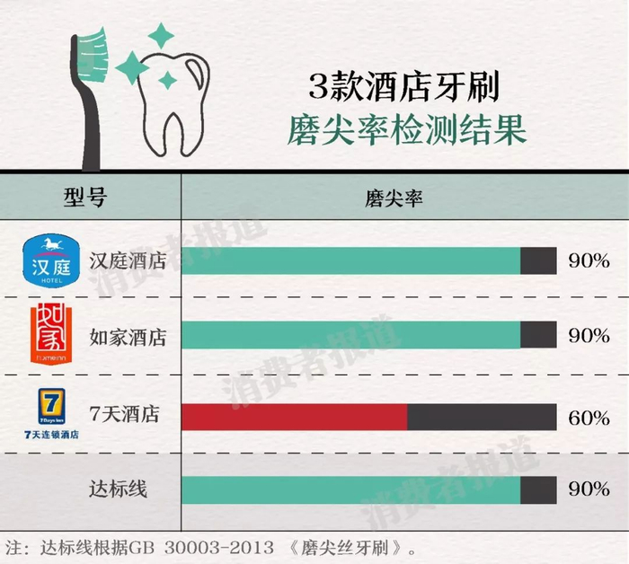 从这次3款酒店牙刷的对比测试来看,7天酒店的牙刷磨尖率仅为60%,未达到国标要求,属于不达标产品。