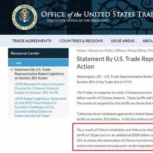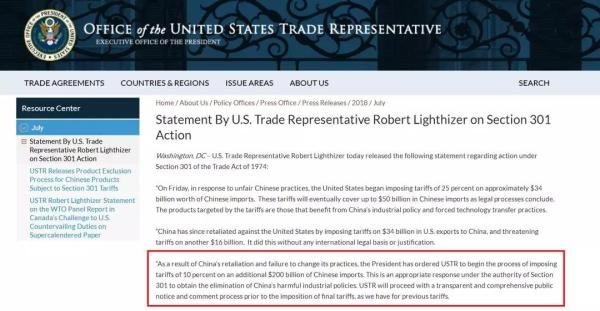 美国贸易代表莱特希泽当天在USTR官网发布了计划对中国商品加征关税的声明,又把特朗普政府之前说过的车辘轳话再次浓墨重彩地强调了一遍,主要内容包括以下三方面: