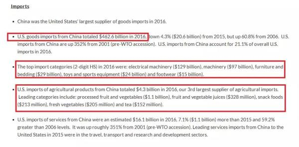 首先,从中方向美方的出口结构来看:2016年美国从中国进口总值4626亿美元,是美国最大的商品供给方。进口额最高的是电子机械类产品(1290亿美元),机器(970亿美元),家具及寝具(290亿美元),玩具及运动装备(240亿美元),鞋类(150亿美元)。此外,从中国进口的农产品总额43亿美元(这已经是美国第三大农产品供应方了),其中占比最高的是加工后的水果及蔬菜(11亿美元),水果及蔬菜汁(3.28亿美元),快餐休闲类食品(2.13亿美元),新鲜蔬菜(2.05亿美元)及茶叶(1.52亿美元)。