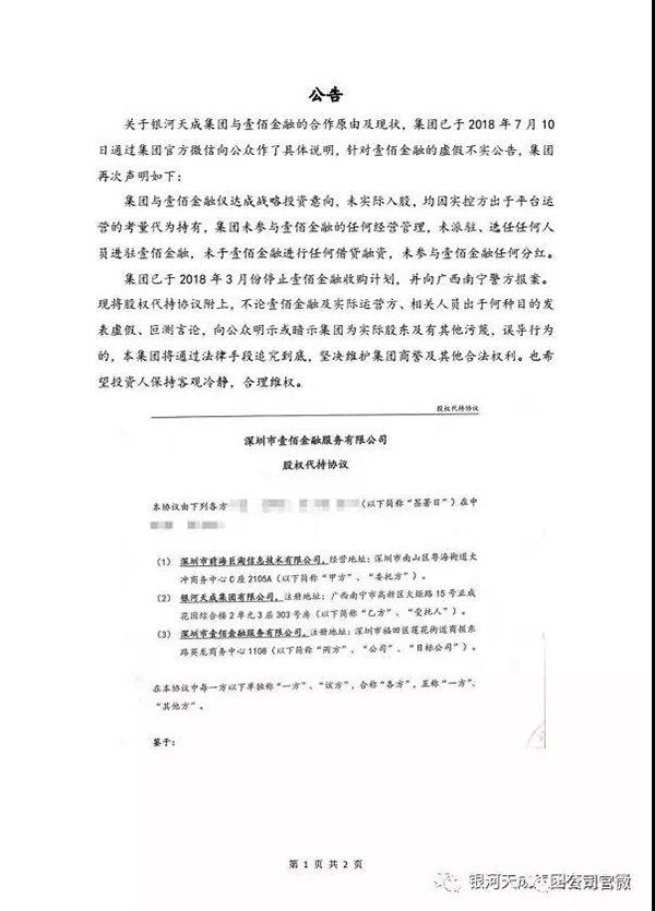 银河天成再次声明公司已于今年3月停止收购壹佰金融,并附上股权代持协议,拒绝承认其为壹佰金融的实际控制方。