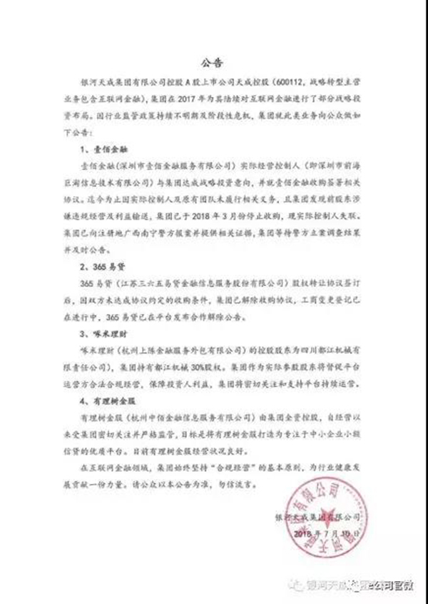 7月10日,e公司官微刊发了壹佰金融“炸雷”事件的现场报道,当天,壹佰金融的大股东银河天成集团有限公司(简称“银河天成”)在自己的公众号上公告表示,因互联网金融行业监管政策持续不明朗及阶段性危机,集团特此就此类业务向公众公告。