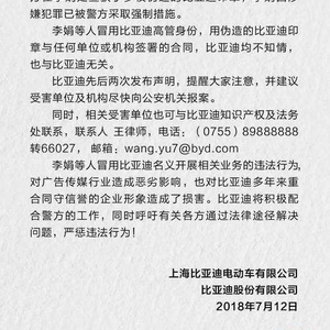 然而,7月12日,比亚迪又发布了一则《关于李娟等人冒用比亚迪名义开展相关业务的声明》,披露了这一事件更多详情,声称李娟假冒上海比亚迪电动车有限公司市场部总经理身份,使用与比亚迪邮箱域名@byd.com高度近似的邮箱域名@sh-byd.com,伪造比亚迪多枚印章,以比亚迪名义,与多家单位及机构展开广告宣传类合作。这份声明再次明确,李娟等人的这一行为比亚迪均不知情,也与比亚迪无关。