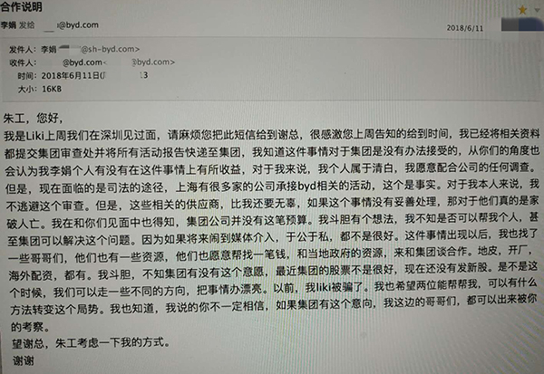 而澎湃新闻记者随后从媒介供应商处得到的一封显示为李娟被抓前发给比亚迪“朱工”的求情信件中看到,李娟声称这些供应商比她还无辜,如果事件不能被妥善处理,他们很可能“家破人亡”。