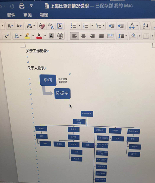 供应商们向记者出示了几张李娟电脑中被恢复的文件截图。第一张“工作记录”便是十分清晰的比亚迪内部架构图,上面以树状图标清了比亚迪品牌公关部、市场部、汽销大区、采购处、审查处各个管理人员、执行人员的姓名与层级,而这五大部门则通过陈振宇、宋博二人向比亚迪集团副总裁李柯汇报工作。