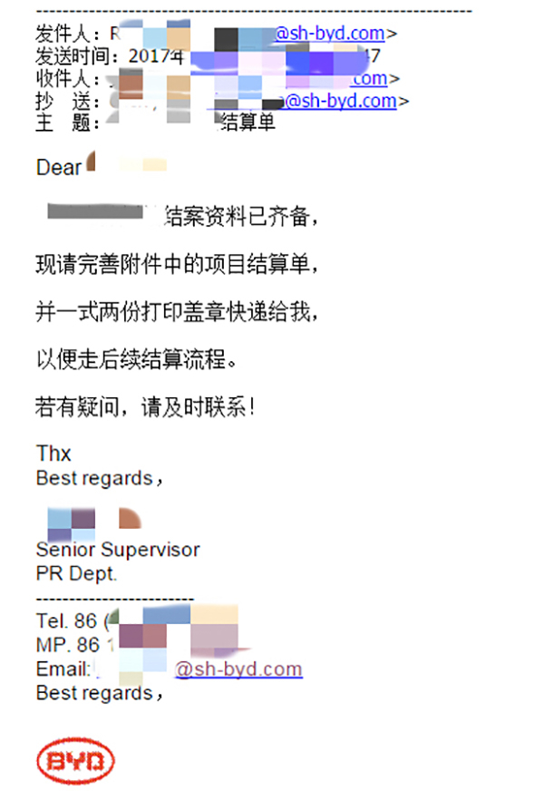 第三张截图则显示出了供应商们得到的李娟分派的“项目”,李娟(或其员工)使用地址为“@sh-byd.com”邮箱与供应商沟通敲定合同、结算项目后续费用等事宜,而“@sh-byd.com”邮箱正是比亚迪官方声明中一再强调的李娟与其员工所用的“盗版”邮箱。