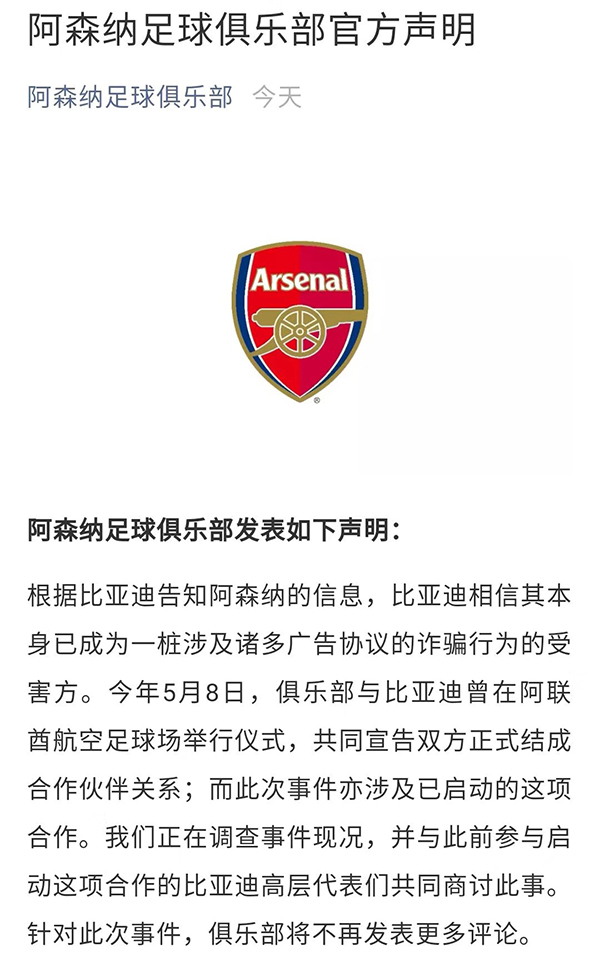 而在记者发稿前,阿森纳已经发表官方声明,“我们正在调查事件现况,并与此前参与启动这项合作的比亚迪高层代表们共同商讨此事,针对此次事件,俱乐部不再发表更多评论。”