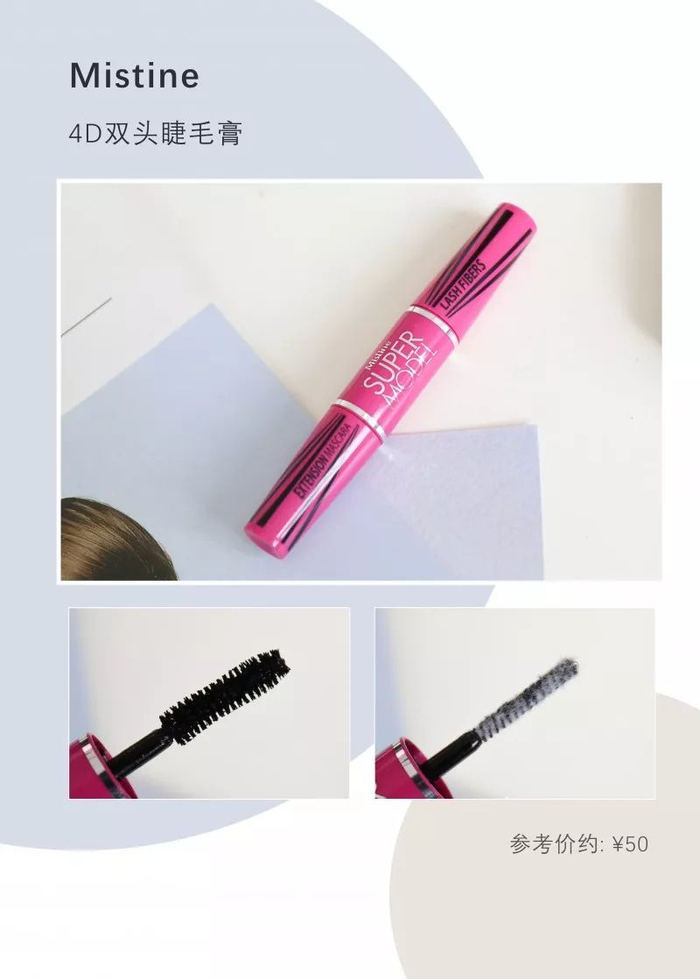 泰国的本土品牌,比较"传统"的那种一头睫毛膏一头纤维的设计。其实我个人不是很喜欢这种设计,这样会很麻烦,需要刷3次。而且容易出现睫毛很不均匀的情况。