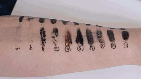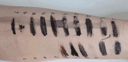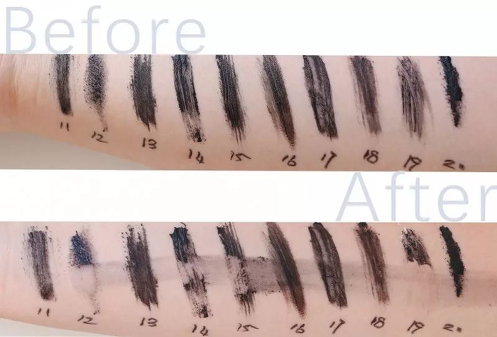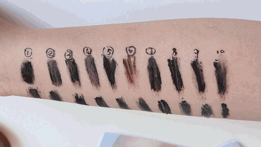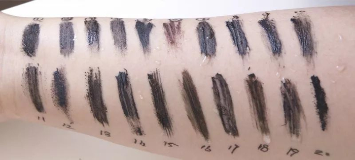小编要对它们进行一场公平公正公开的膏体测试(ps:辛苦这位被我夺走小手臂的同事,给你加鸡腿!)。测评都是待膏体上手干透之后再进行的,绝对没有一点点的偏心,也绝对没有添加任何不公平因素!序号是按照上文睫毛膏出现的顺序排列的,文末也给大家准备了表格,方便大家挑选!