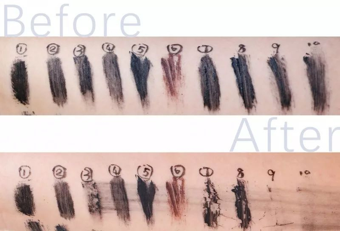 1(By Terry)、2(CPB)、4(HR)、5(Kiss me黑)、6(Kiss me棕)在普通卸妆水的测评中,依然保持完整。