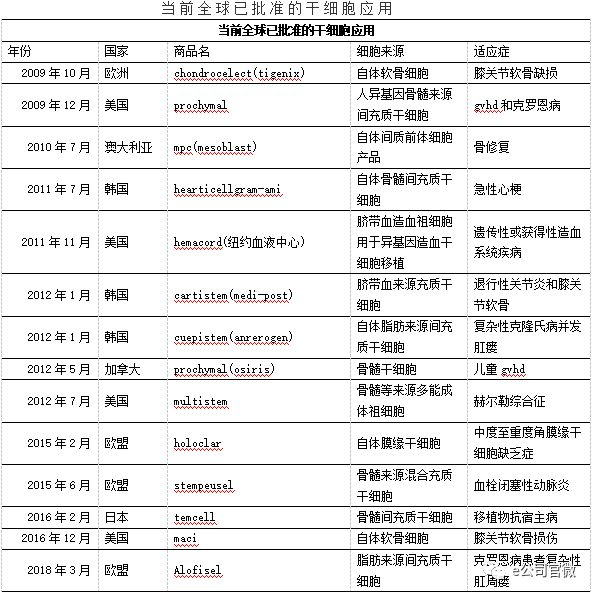 干细胞产业应用潜力巨大, 干细胞治疗、美容等领域的应用是未来增长的爆发点。根据国际研究机构Market Research 等的研究,2018年全球干细胞产值预计超过千亿美元。目前,全球已经有了14款获批上市的干细胞药物或疗法,以美国、韩国、欧洲为主,包括与天士力合作的Mesoblast,2010年7月,就有一个用于骨修复的产品上市。今年,各国、地区政府仍在大力推动干细胞产业的发展。