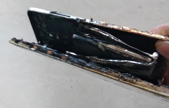 无独有偶,7月16日,一台购于京东商城的红米Pro在未充电的情况下,放置于铺有凉席的床上,没有覆盖物。据消费者称,当时正开着空调午睡,先是朦胧中听到“呜呜”的声音,接着发现红米Pro出现自燃和爆炸现象,导致凉席起火冒黑色烟雾,情急之下用手将手机拨到地上致使手部受伤、木地板受损。该红米Pro机身炸得像张开的河蚌,内部零件因高温灼烧呈焦黑状,电池周边疑似被撑开,爆炸或是从内向外发生。