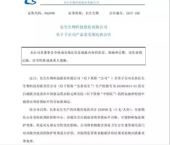 7月17日,有媒体爆料称,深圳证券交易所2017年11月6日公布的《长生生物关于子公司产品有关情况的公告》中有这样的内容,“近日,长生生物科技股份有限公司全资子公司长春长生生物科技有限责任公司生产的批号为 201605014-01 的百白破联合疫苗,在中国食品药品检定研究院的药品抽样检验中,被检出效价指标不符合标准规定。”这批百白破疫苗共有 252600支,全部销往山东省疾病预防控制中心。