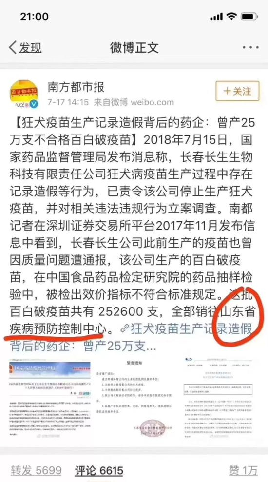 长春长生公司生产的不合格百白破疫苗销往山东的消息