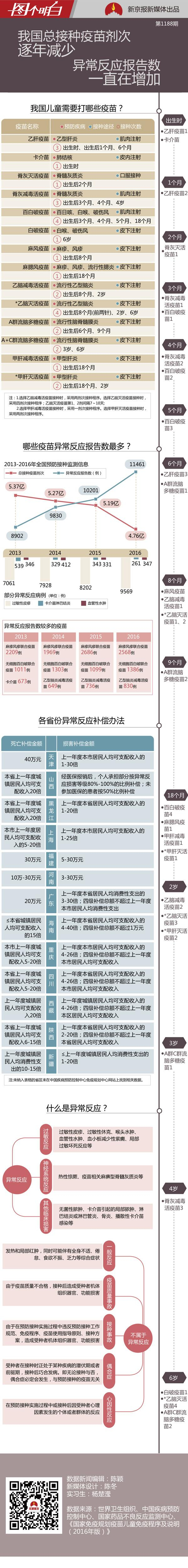 数据显示,2013~2016年4年间,我国总接种疫苗超过20亿剂次,异常反应报告数4万多例,总报告发生率为0.002%。其中最常见的异常反应有过敏性皮疹、卡介苗淋巴结炎以及血管性水肿。而出现异常反应较多的疫苗包括麻疹风疹联合疫苗、无细胞百白破联合疫苗以及乙型脑炎减毒活疫苗。