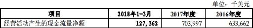 SQM 2016年至2018年1-3月经营活动产生的现金流量净额为6.34亿美元、7.04亿美元、1.27亿美元。