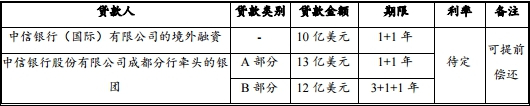 3. 并购银团贷款:2018年5月4日,公司与中信银行股份有限公司成都分行签署了《贷款承诺函》,该银行承诺以银团贷款方式提供25亿美元并购贷款。
