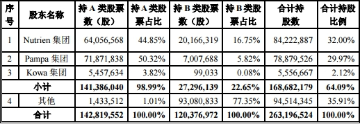 SQM的股本构成包括A类股和B类股,合计股份数量为2.63亿股,其中A类股为1.43亿股,占已发行股份总数的54.26%,B类股为1.20亿股,占已发行股份总数的45.74%。截至2017年12月31日,股东情况简要如下: