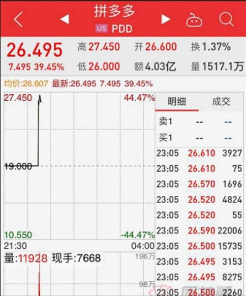 每日经济新闻记者注意到,26日拼多多ADS股价开盘跳涨39.45%,冲到26.5美元。