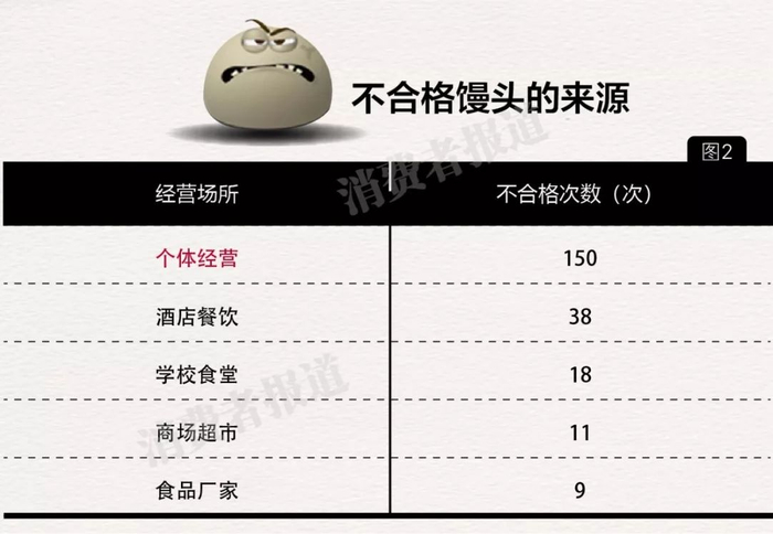 在226批次不合格馒头中,逾六成来自个体经营场所,包括栖身于大街小巷、市场周边的各种早餐店、包子店、小吃店。这可能与生产者缺乏“安全意识”或存在侥幸心理有关。