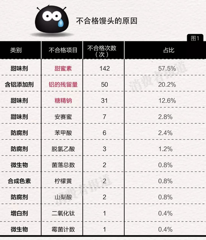 其中,检出甜蜜素成为馒头不合格的主因,其次为铝的残留量不达标,再为检出糖精钠,三者共占了不合格比例的九成以上。