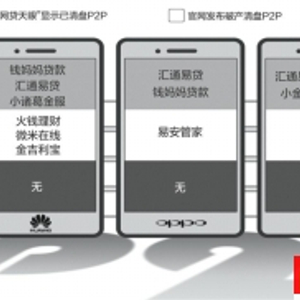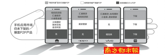 南都记者从第三方平台“网贷天眼”的“爆雷”(已经发布破产清盘或者老板失联)P2P名单中选出15家规模较大的平台,在手机厂商的应用商店搜索发现,除了整改后的小米商城完全下架外,华为、OPPO、vivo都还存在未下架的“爆雷”产品APP。