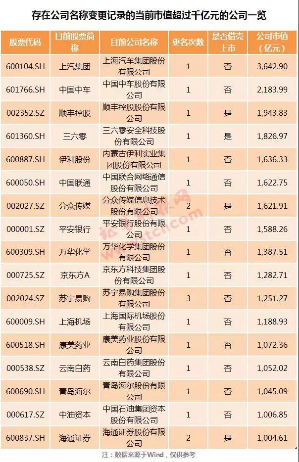 一般来说,大型公司频繁进行更名的情形较少。数据显示,当前市值超过千亿的有过更名记录的17家公司中,在剔除借壳原因进行更名的公司后,仅苏宁易购的更名记录超过一次,该公司累计更名记录达到3次。