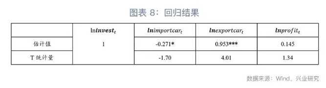 考虑到数据可得性,本文选取2012年3月至2018年5月的月度数据,对数据取对数后进行回归分析。考虑到非平稳数据可能带来伪回归,本文在回归分析之前对变量进行平稳性检验,发现其均为零阶单整。基于此进行回归发现,在10%的显著性水平下,汽车整车及其零配件进口对汽车制造业投资具有显著的负向冲击,而汽车行业出口则在1%的显著性水平下对汽车制造业投资具有显著的正向促进作用,参见图表8。